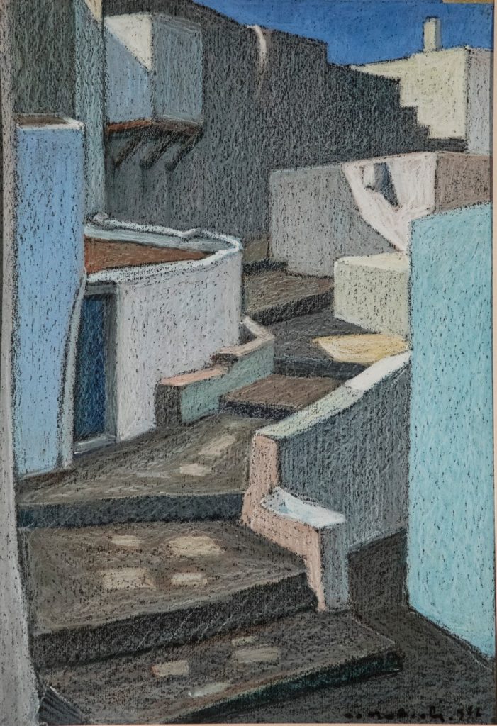 “E che egli ami la Grecia ce lo dicono i suoi quadri di paesaggi, così amorosamente dipinti e profondamente sentiti. Si tratta di paesaggi dipinti nelle isole greche: Santorino, Serifos, Scopelos; isole dell’Egeo, capaci di evocarci un mondo classico ormai remoto. Paesaggi però che hanno molti elementi in comune con certi paesaggi nostrani, con certi paesaggi della Toscana, ove il verde cupo del cipresso si sposa altrettanto bene con l’argento degli ulivi, ove spesso la linea dolce e sinuosa delle crete chiude musicalmente l’orizzonte”. (Nota 2)