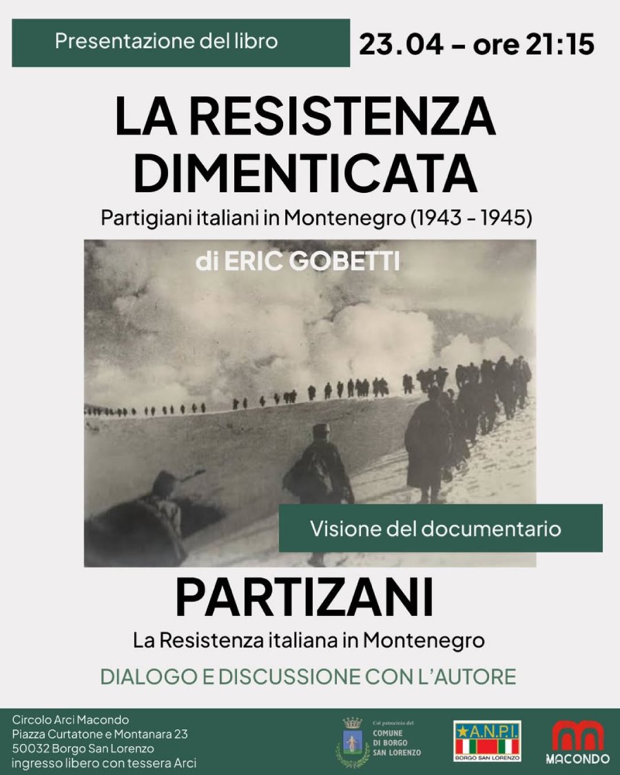 BORGO SAN LORENZO – Giovedì 23 Aprile alle 21.25 al circolo Arci Macondo di Borgo San Lorenzo, sarà presentato il libro “La Resistenza dimenticata. Partigiani italiani in Montenegro (1943-1945)”. Per l’occasione sarà presente l’autore Eric Gobetti, e la discussione sarà poi seguita dalla proiezione del documentario “Partizani”.