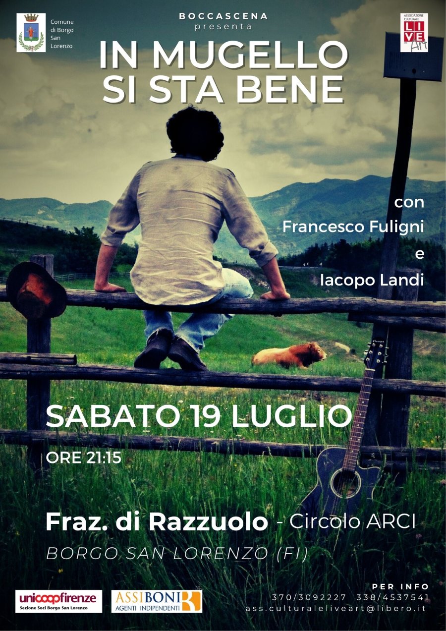 Altro appuntamento sabato 19 Luglio alle 21.15. Alla “Casa del popolo” di Razzuolo, alle 21.15, sarà messo in scena lo storytelling “In Mugello si sta bene”, con Francesco Baba Fuligni e Iacopo Iuzzo Landi. Una performance che promette riflessioni e sorrisi, intrecciando storie, personaggi e atmosfere legate al territorio. Serata organizzata in collaborazione con l’associazione “Un amico per tutti”, che prevede prima dello spettacolo, alle ore 19:30, una cena il cui ricavato andrà all’ospedale Meyer.