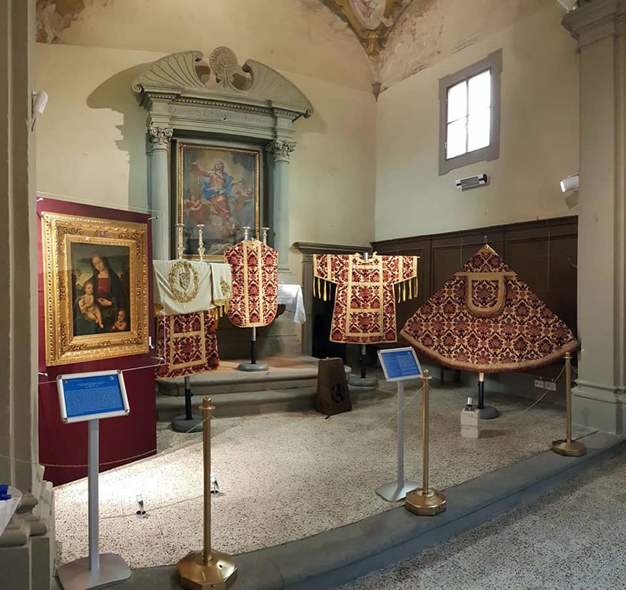 Nella zona vicino all’altare sono poi esposti un parato liturgico completo in quarto (piante, due tonacelle e piviale) in velluto cesellato di seta di manifattura fiorentina del XVI secolo, un bel dipinto cinquecentesco raffigurante la Madonna con Bambino  e San Giovannino ed un Messale Romano.