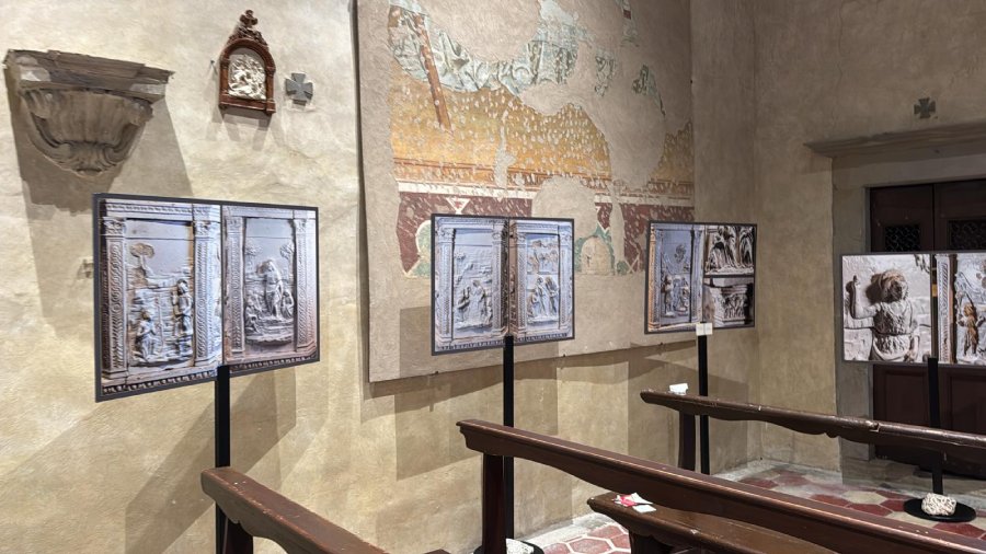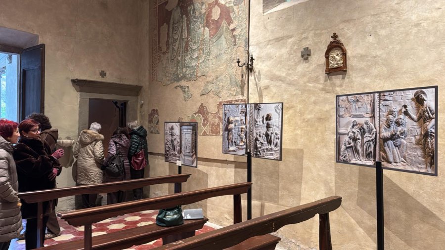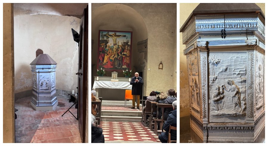Questa iniziativa è stata impreziosita da una conferenza di Marco Pinelli, storico dell’arte mugellano, e dalle foto di Francesco Noferini, che hanno “riportato” al loro posto le opere che in origine arricchivano la chiesa di Camoggiano. Così, insieme alla riproduzione della grande pala d’altare cinquecentesca, dipinta da Bartolomeo di Giovanni, ora custodita nella pieve barberinese di San Silvestro, c’erano anche riprodotte le preziose predelle, i cui originali sono al museo di Liverpool, due, mentre una risulta dispersa (articolo qui). E Noferini non solo ha realizzato le immagini delle singole formelle in ceramica dell’antico fonte battesimale di Benedetto Buglioni, ma ha fatto il ‘miracolo’ di riportare nella sua sede originaria di Camoggiano l’intero fonte (che adesso fa parte del museo Beato Angelico di Vicchio), ricreando in forma ridotta, in tre dimensioni, l’opera d’arte.