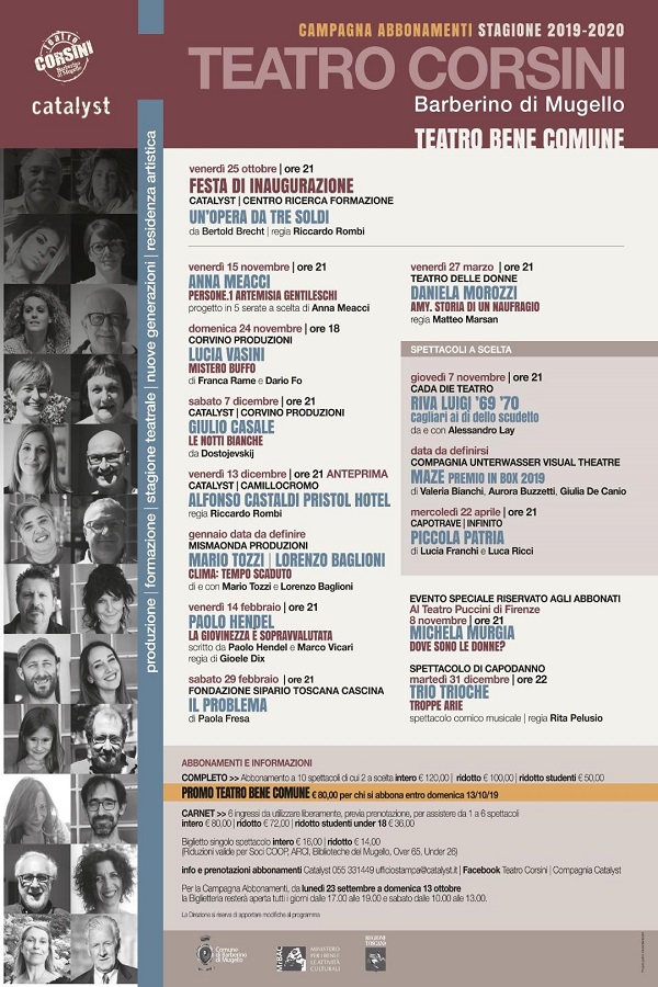 BARBERINO DI MUGELLO – Con l’arrivo dell’Autunno arriva anche la nuova Stagione di Prosa del Corsini di Barberino di Mugello: “Teatro Bene Comune”. In attesa di conoscere nello specifico tutti i progetti e le iniziative del Corsini, si dà il via alla campagna Abbonamenti “Io Mi abbono perché…”, che attraverso le testimonianze di vecchi e nuovi abbonati, ambisce a rimettere il teatro al centro della Comunità. Anche per questo il lancio della nuova Stagione si accompagna a una promozione speciale che porta il costo dell’abbonamento completo a 10 spettacoli, da € 100,00 a € 80,00 per chi si abbona entro domenica 13 ottobre.