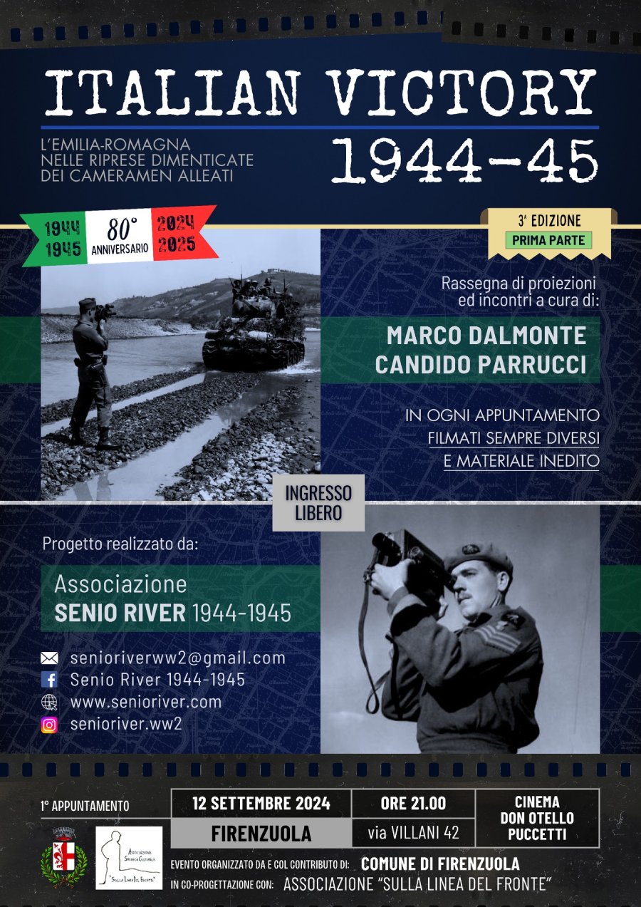 FIRENZUOLA – Tra gli eventi organizzati in occasione dell’anniversario del bombardamento di Firenzuola, avvenuto il 12 Settembre 1944, tra gli altri eventi tra i quali la Santa Messa, l’inaugurazione di una mostra nella cappellina dell’ex seminario ed il concerto spettacolo del gruppo “Mulieres Voces” al “Museo della pietra serena”, giovedì 12 Settembre alle 21.00 al cinema Don Otello Puccetti di Firenzuola si terrà anche la prima proiezione della rassegna “Italian Victory 1944-45”, organizzata dal Comune di Firenzuola in co-progettazione con l’Associazione “Sulla Linea del Fronte”, la prima proiezione della rassegna “Italian Victory 1944-45” avrà luogo il 12 Settembre presso il Cinema DOP in Via Villani 42.