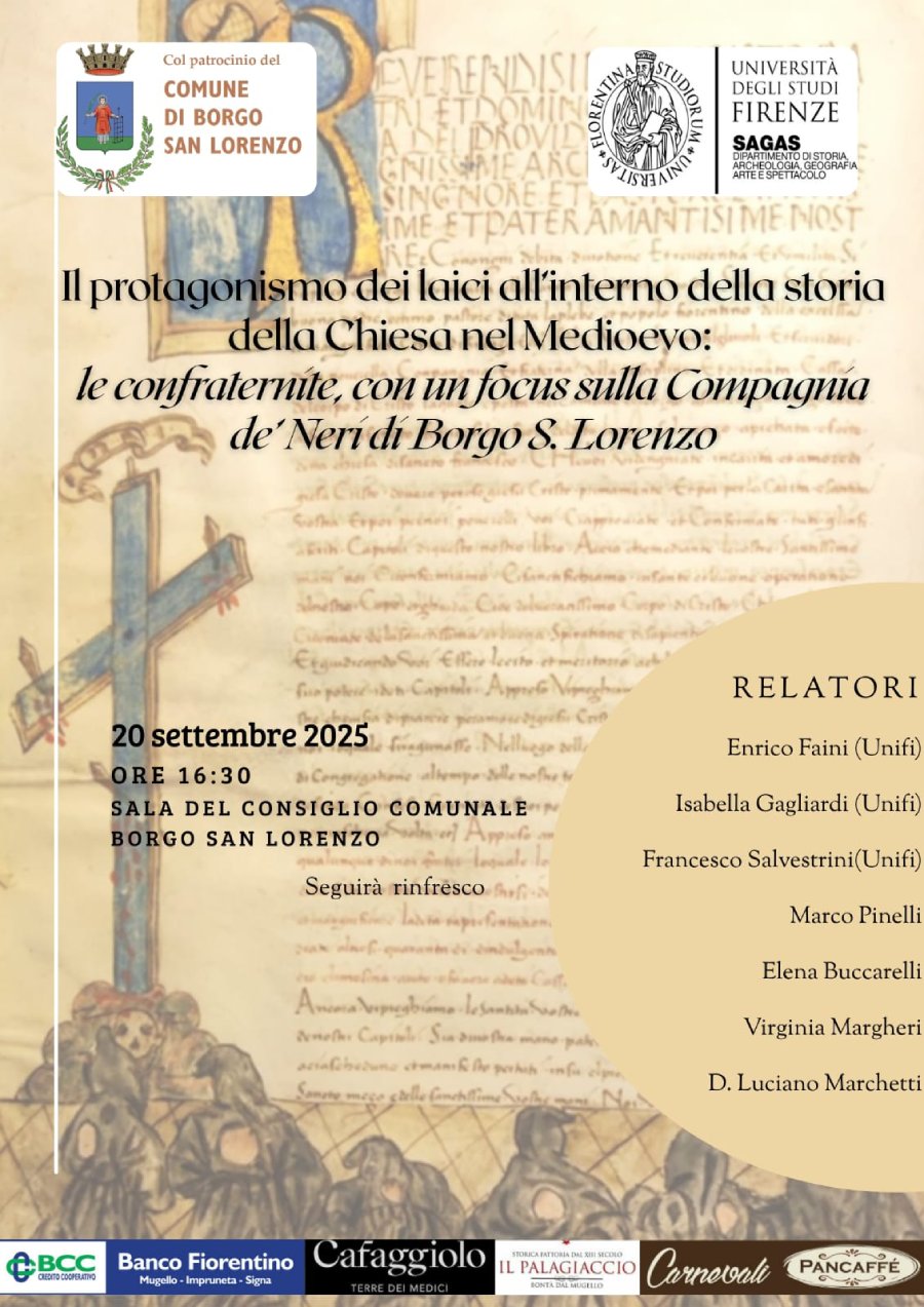 BORGO SAN LORENZO – Sabato 20 Settembre alle 16.30 nella sala del consiglio Comunale di Borgo San Lorenzo si terrà un incontro su “Il protagonismo dei laici all’interno della storia della Chiesa nel medioevo: le confraternite, con un focus sulla Compagnia de’ Neri di Borgo San Lorenzo”.