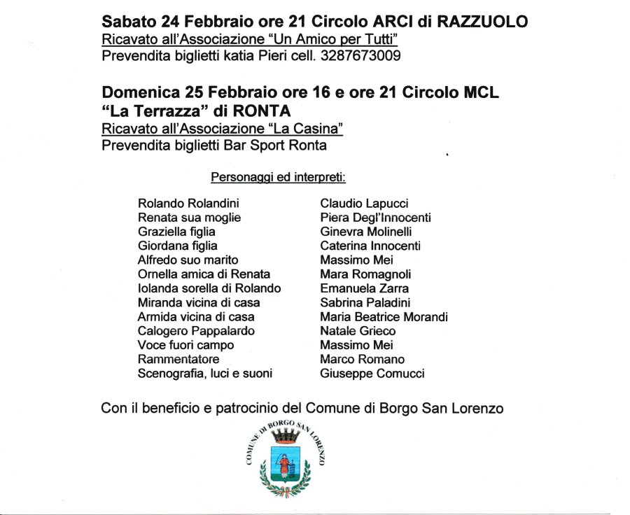 BORGO SAN LORENZO – La Compagnia del Sorriso di Ronta presenta la sua nuova commedia in due atti “Ma in treno ci vo’!”, scritta da Piera Degl’Innocenti Comucci. La “prima” si terrà sabato 24 febbraio alle ore 21.00 al Circolo di Razzuolo e l’incasso sarà devoluto all’associazione “Un Amico per Tutti”. Si replica domenica 25 Febbraio alle 16.00 e alle 21.00 al circolo La Terrazza di Ronta e in questo caso il ricavato sarà devoluto all’associazione “La Casina”