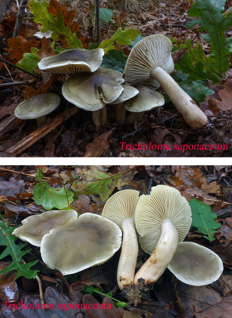 (27) Specie commestibili del genere Tricholoma. La specie più pregiata di questo genere e rinvenibile in Mugello nell’autunno anche inoltrato (ma, che io sappia, solo in poche stazioni) è Tricholoma portentosum, ove l’epiteto specifico non si riferisce al portamento o alle dimensioni “portentose” bensì alla sua ottima commestibilità. Tuttavia si tratta di un fungo destinato ai raccoglitori già esperti perché confondibile con Tricholoma simili e spesso tossici. Discriminanti da tenere in considerazione per questa specie sono: carne di colore grigio-giallina e con odore e sapore molto buoni come di farina fresca o di impasto per fare il pane; cappello con superficie liscia ma fibrillosa e di aspetto quasi “lucido-metallizzato”, di colore grigio ardesia con sfumature verdoline; gambo biancastro ma con sfumature giallastre soprattutto all’apice; lamelle di colore grigio chiaro sfumate di un tenue giallino.