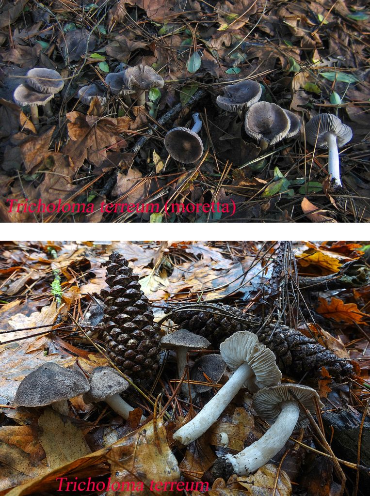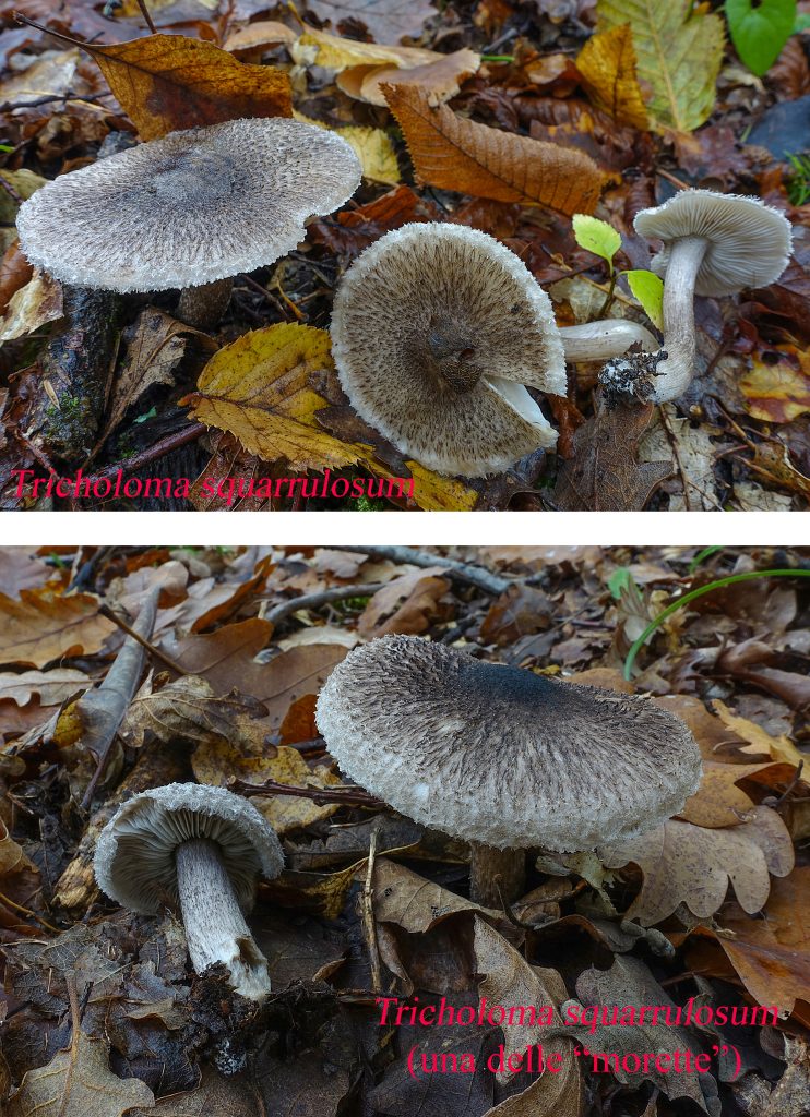 Più semplici da determinare, tra i Tricholoma con cappello di colore grigiastro, sono le cosiddette morette grazie alla cuticola del cappello che si presenta più o meno lanoso–feltrata e mai né squamettata né liscia (come invece accade per le 5 specie tossiche elencate qui sopra). Pur se di commestibilità inferiore ai “portentosi”, sono classificate come buoni commestibili. Tra quelle più frequenti in Mugello vi sono Tricholoma squarrulosum (caratterizzato oltre che dalla cuticola nettamente feltrata-lanosa, anche dall’odore aromatico-speziato, come di farina mescolata con del pepe macinato e dalla carne dal sapore analogo; frequente sotto Quercia o Castagno) e soprattutto Tricholoma terreum (la “moretta” per antonomasia; con odore molto leggero erbaceo/terroso ma più frequentemente nullo, e carne dal sapore dolce, mite di farina o erbaceo; frequente sotto le varie specie di Pino).
