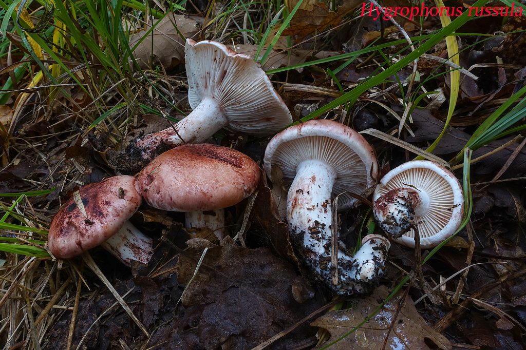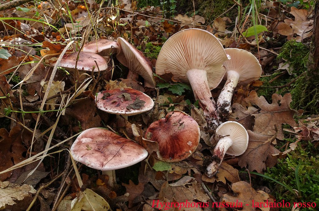 (24) Alcune specie del genere Hygrophorus. Di questo genere abbiamo già incontrato un rappresentante, ottimo commestibile, al capitolo (5) di un precedente articolo, l’Hygrophorus marzuolus detto marzuolo o dormiente. E così come il dormiente è una primizia reperibile all’inizio della “stagione micologica”, vi sono altri Hygrophorus considerati buoni commestibili che sono viceversa rinvenibili verso la fine della stagione perché tipicamente autunnali. Tra questi i più frequentemente raccolti e consumati sono i cosiddetti lardaioli, in particolare Hygrophorus russula (il lardaiolo rosso) e Hygrophorus penarioides (il lardaiolo bianco). Facilmente riconoscibile il lardaiolo rosso: habitat presso latifoglie, soprattutto querce; cappello macchiato di rossiccio su fondo biancastro; carne compatta e consistente, bianca, dal sapore nullo o leggermente amarognolo; lamelle relativamente fitte (le più fitte tra tutti gli Hygrophorus) e di colore da biancastro a bianco-carnicino a maturità. La cuticola del cappello è, soprattutto a tempo umido (cioè molto spesso, visto il periodo di fruttificazione), abbastanza appiccicosa, cosa che la rende quasi sempre cosparsa di frammenti di sottobosco o vegetali particolarmente fastidiosi in fase di pulizia. Ma in questa specie la cuticola si può togliere con facilità dal cappello e quindi è consigliabile “sbucciare” gli esemplari prima di metterli nel cesto, sia per evitare un sovrappiù di “appiccicosità” sia perché con l’asportazione della cuticola il lardaiolo rosso perde un po’ del suo sapore amarognolo. Utilizzato nei misti di funghi o per la conservazione sott’olio data la consistenza della sua carne.