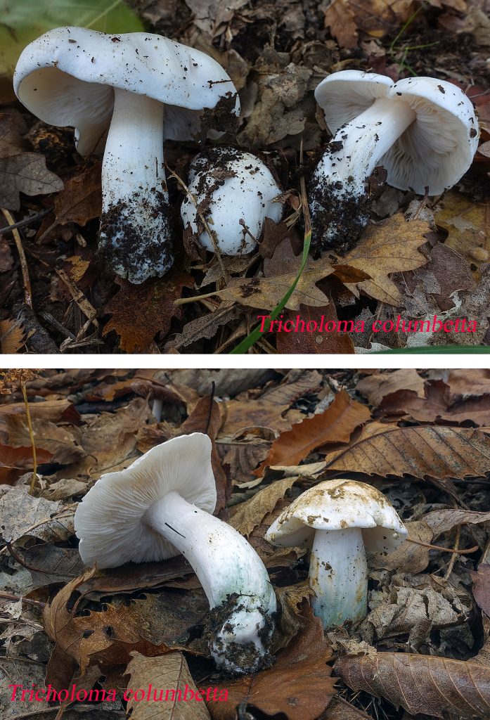 Facilmente determinabile anche il bianco e candido Tricholoma columbetta soprattutto quando presenta la base del gambo soffusa di verde-acqua o, più raramente, sfumata di rosa. Ottimo commestibile, dall’odore come di farina fresca e dalla carne di sapore gradevolmente dolce.
