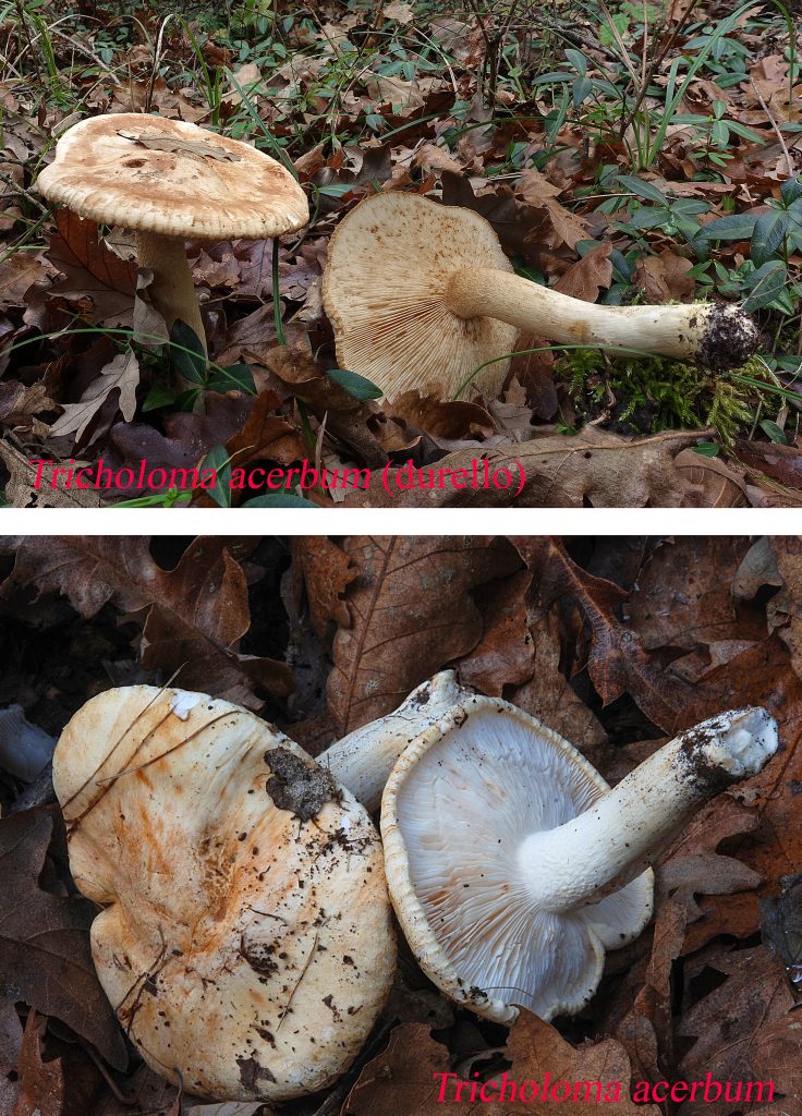 Merita solo un accenno il cosiddetto durello, cioè il mediocre commestibile Tricholoma acerbum (incontrato anni fa, a “Bosco ai Frati”, un fungaiolo che ne raccoglieva in abbondanza per prepararli conservati sott’olio). Habitat sotto varie latifoglie, è specie abbastanza facile da determinare: dimensioni medio-grandi con colori generali beige pallido, lamelle molto fitte e margine del cappello a lungo involuto; carne compatta e dura, di sapore amarognolo-astringente. Ne è sconsigliato l’uso perché sembra abbia causato problemi gastroenterici.