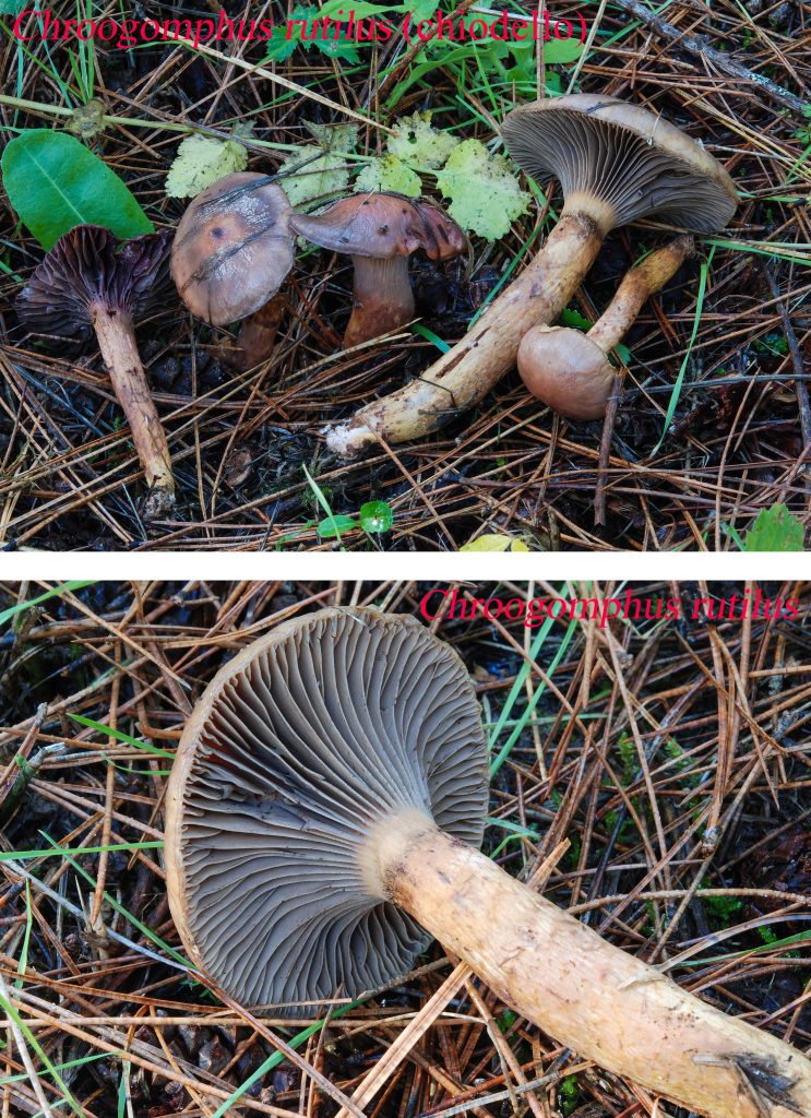 A tempo asciutto il cappello di Chroogomphus rutilus può perdere la sua vischiosità e mostrarsi completamente asciutto e secco, assumendo anche i colori tipici dei due Cortinarius di cui sopra. Elementi distintivi sono comunque e sempre a “portata di occhi”: lamelle dichiaratamente decorrenti sul gambo e sporata in massa nerastra in Chroogomphus rutilus, lamelle smarginate–uncinate e sporata color ocra-ruggine nei Cortinarius.
