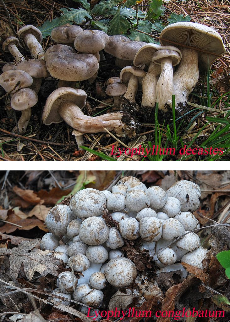 (29) In Mugello si possono reperire anche alcune specie di Lyophyllum. Caratterizzati dalla carne consistente e dura e dalla crescita solitamente e proverbialmente cespitosa o addirittura connata, a gruppi anche di numerosissimi esemplari talvolta riuniti alla base su una massa carnosa e compatta; sporata in massa bianca (quindi differente dalla sporata rosa di alcuni Entoloma tossici che, anche se mai con crescita così cespitosa, nella silhouette possono ricordare i Lyophyllum). I più frequenti sono forse Lyophyllum decastes e Lyophyllum conglobatum. Considerati buoni commestibili, hanno carne dura e consistente, di sapore fungino o di farina o lievemente erbaceo. Sono perlopiù utilizzati per la conservazione sott’olio o sott’aceto.