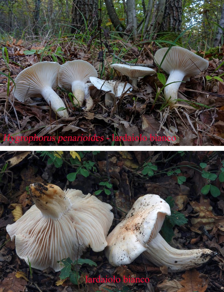 Sicuramente di maggior pregio culinario è il lardaiolo bianco. Reperibile nello stesso habitat e nello stesso periodo del lardaiolo rosso, l’Hygrophorus penarioides si riconosce per la colorazione bianco-avorio diffusa su cappello e gambo, con possibili zone color crema al centro del cappello, per le dimensioni apprezzabili (con cappello fino a 15-20 cm di diametro), per le grandi lamelle abbastanza spaziate tra di loro; e infine, caratteristica non trascurabile, per il suo buon odore che ricorda quello del latte bollito o del burro, percepibile in particolare dopo averne strofinato le lamelle. Considerato da molti il miglior Hygrophorus reperibile in autunno, adatto per varie ricette purché se ne raccolgano esemplari giovani, avendo questa specie la “brutta abitudine” di essere abbastanza precocemente invasa da grosse larve.