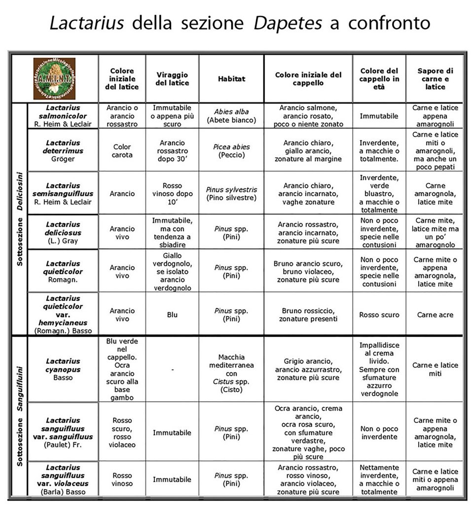 I lattari considerati commestibili sono, con pochissime eccezioni, quelli che mostrano latice colorato in una gamma di sfumature che vanno dall’arancio al rossastro: rosso vinoso, arancio più o meno vivo, color carota. Fanno quindi parte, all’interno del genere Lactarius, della Sezione Dapetes. Nella tabella seguente, tratta dall’Archivio dell’A.M.I.N.T., ne vengono elencate le singole specie, con le varie informazioni utili per avvicinarsi alla corretta determinazione.