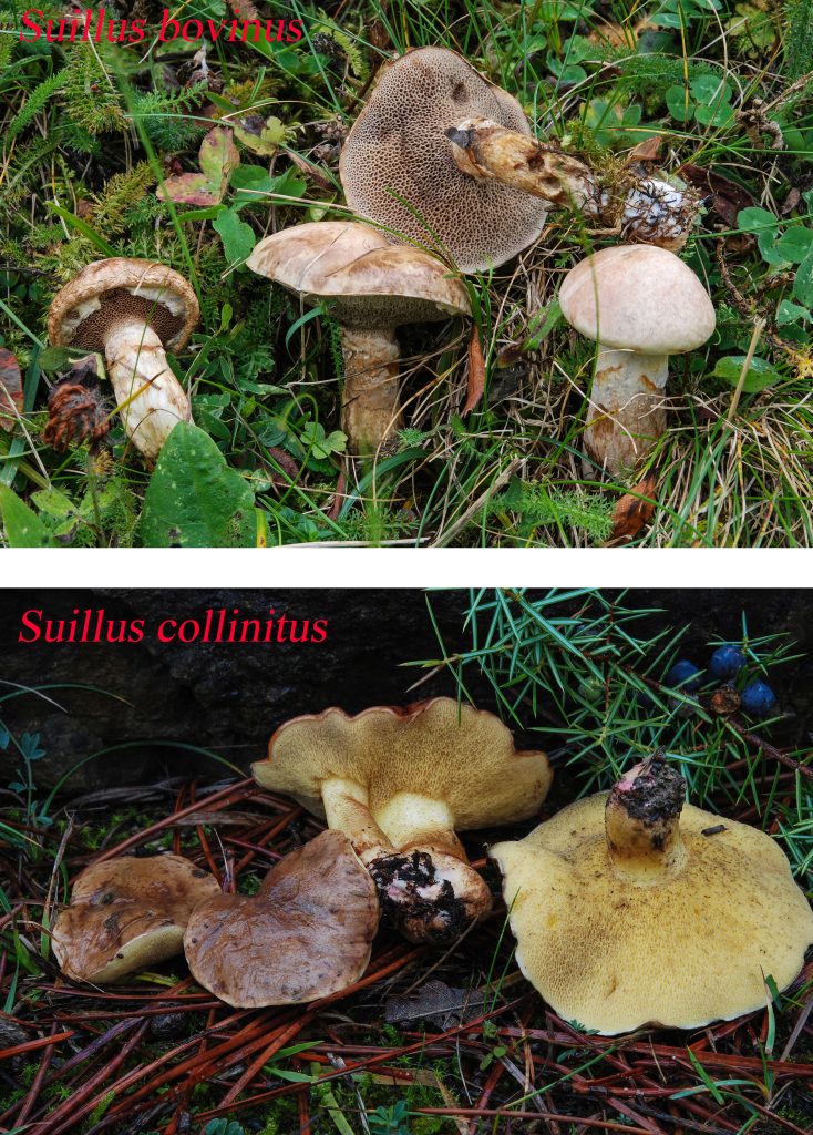 (19-4) Varie specie del genere Suillus. Le specie di questo genere sono commestibili ma quasi tutte di scarso valore gastronomico; inoltre, prima di cucinarle, occorre asportare la cuticola del cappello che è viscida e glutinosa, con proprietà sgradevolmente lassative. Ciò non toglie che, anche dopo l’asportazione della cuticola, tale eventualità sia del tutto scongiurata e quindi il loro consumo deve essere fatto con moderazione e più che altro non come “specie unica nel piatto” ma inserita nei misti di funghi per zuppe o ricette simili. In Mugello, sotto il nomignolo di pinaroli (dovuto all’habitat presso varie specie di Pino, pur fruttificando anche sotto altre conifere), ne vengono raccolte soprattutto due specie: Suillus luteus (con presenza di anello sul gambo) e Suillus granulatus (simile al precedente ma mancante di anello) in quanto considerate le più saporite a patto che vengano utilizzate da giovani, altrimenti rimangono indigeste. Altri pinaroli come, ad esempio, Suillus bovinus o Suillus collinitus non sono presi in considerazione perché insipidi.
