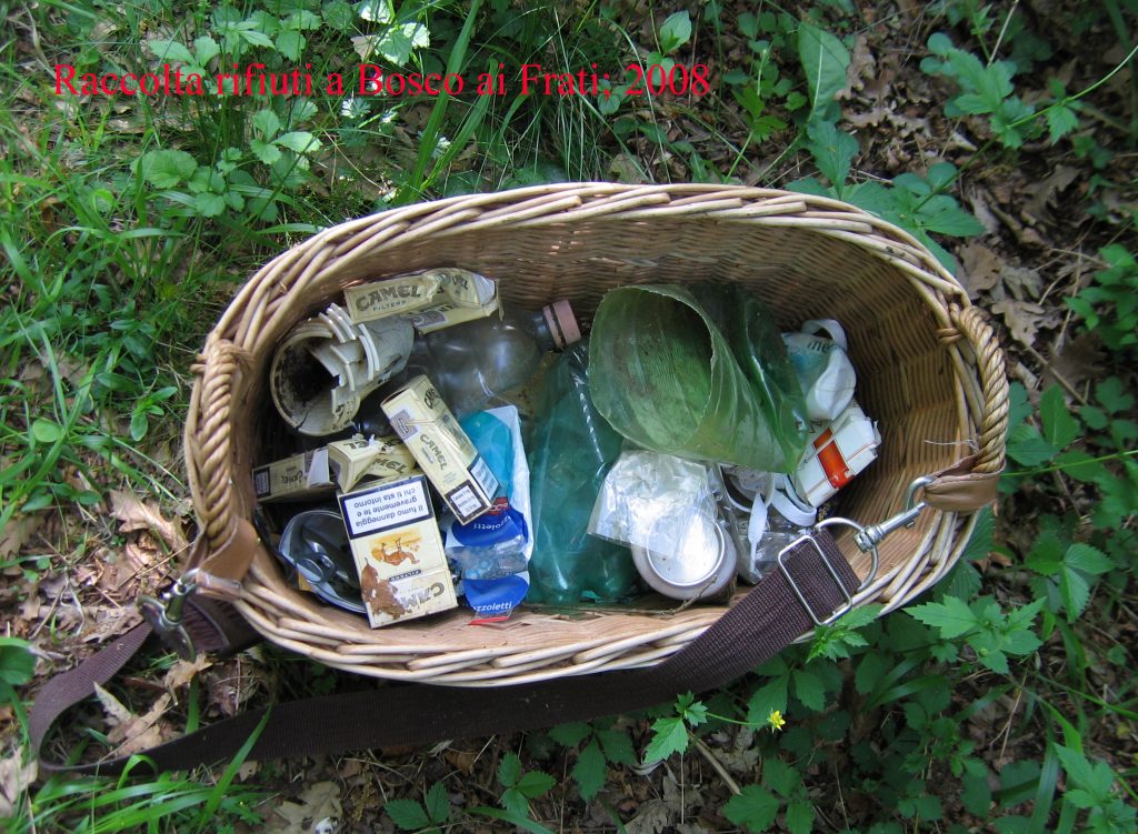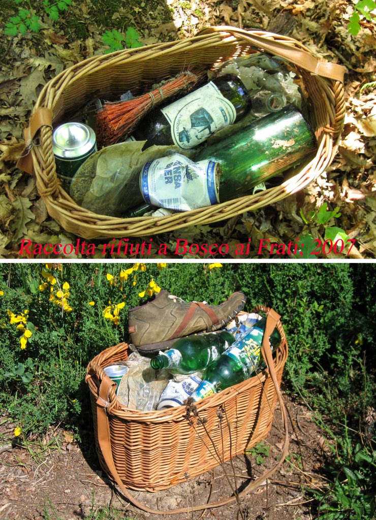 Nonostante la non eccessiva estensione si tratta di una zona oltremodo famosa, da tante generazioni di fungaioli, per le nascite talvolta straordinarie di estatini (Boletus reticulatus) ma soprattutto di neri (Boletus aereus), nonché di allovoli (Amanita caesarea), per non dire della sua facilissima “percorribilità”, sviluppandosi praticamente in pianura. Nelle mie girate vi ho trovato anche specie abbastanza rare come Amanita eliae e Exudoporus permagnificus; insomma un bosco magico a tutti gli effetti. Una sua buona parte è di proprietà dell’Azienda Agricola Schifanoia e fino a 15-20 anni fa era ad accesso completamente libero. Tuttavia nel periodo-da-porcini, col passare degli anni, il bosco veniva invaso da un sempre più numeroso esercito di fungaioli/cavallette più o meno (molti i “meno”) corretti, con qualcuno che ci organizzava addirittura dei picnic, e con evidenti danni apportati alle piante e al sottobosco (spesso letteralmente raspato, anche a suon di rastrelli, tipo “branco di cinghiali”), nonché con uno spargimento di rifiuti non indifferente. Non gradendo la confusione nel bosco, lo frequentavo quando era definitivamente finito il boom delle nascite di porcini con la certezza di trovarvi sia pochissime persone sia qualche porcino ritardatario; qualche volta ci entravo armato di 2 cesti: uno per i porcini e uno per i rifiuti che raccoglievo per portarli via; e regolarmente il cesto con i rifiuti risultava il più pieno. Di ogni genere: dalla scatoletta di tonno alla bottiglia grande, in vetro, del vino o a quella più piccola del succo di frutta; dal pacchetto di sigarette ai foglietti delle caramelle; dalla lattina di birra a ogni altro tipo di contenitori in plastica. Una vergogna.
