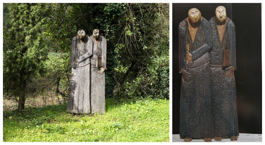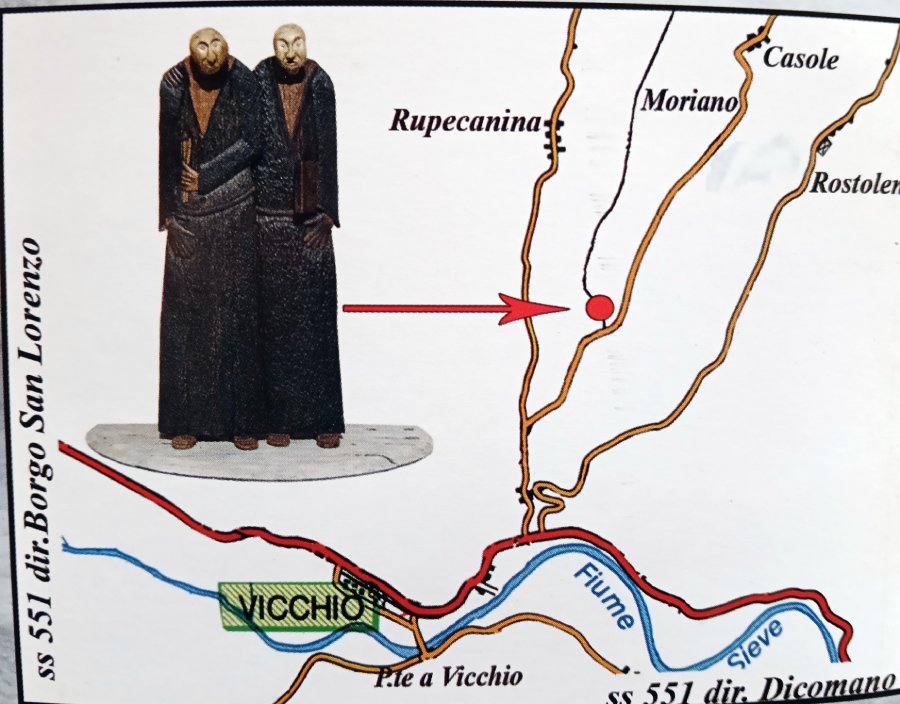 Intitolato all’Angelico, il museo comprensoriale di Arte Sacra di Vicchio al suo ingresso ha la statua in bronzo che lo raffigura, opera dello scultore Sergio Benvenuti, copia di un’analoga statua eseguita dello stesso per la Chiesa fiorentina di San Marco. Un’altra scultura, stavolta in legno, dedicata al domenicano, si trova a Vicchio, all’inizio della strada sterrata che porta alla casa del Beato, in località Moriano. Opera suggestiva dagli echi bruegheliani risalente al 2008 e facente parte dei “Percorsi d’Arte” del Comune di Vicchio (sindaco Bolognesi, assessore alla cultura Martin), dell’eccellente Luca Mommarelli, scultore del legno. Ritrae il grande artista passeggiare nei luoghi della sua infanzia col fratello Benedetto, anche lui domenicano e buon miniaturista. Il corpo de “I Frati” – questo il titolo dell’opera alta oltre 2 metri – è realizzato con doghe di botte di castagno intagliate, mentre le teste sono due enormi sferoblasti (protuberanze che si trovano alla base dei castagni più antichi e che altro non sono che rami non sviluppati).