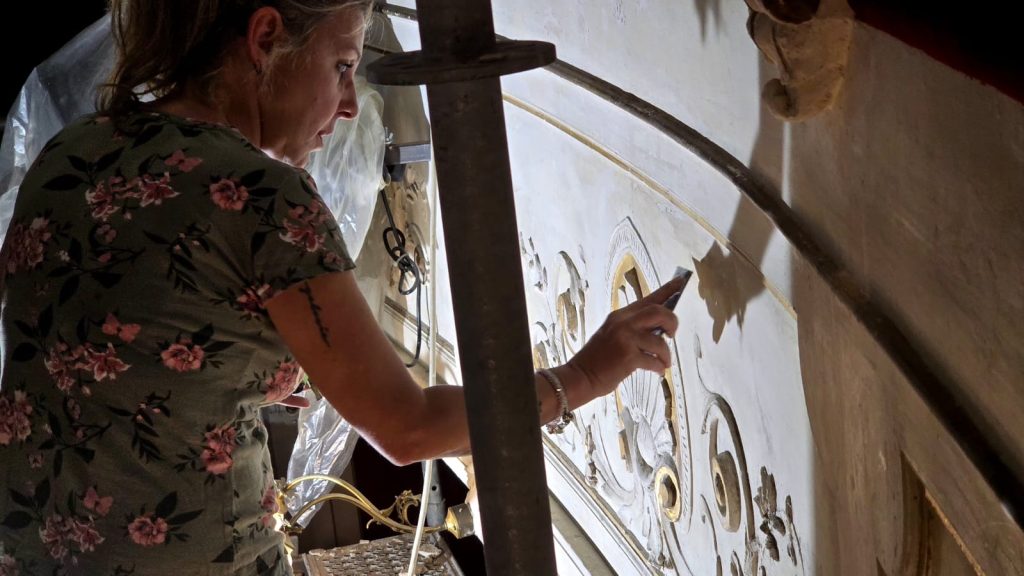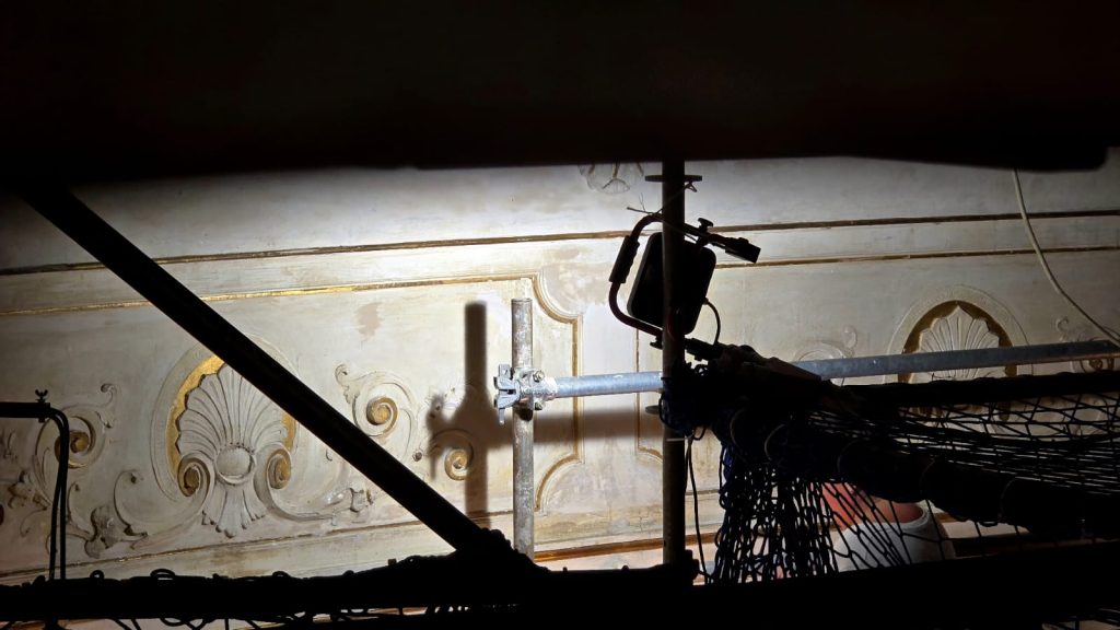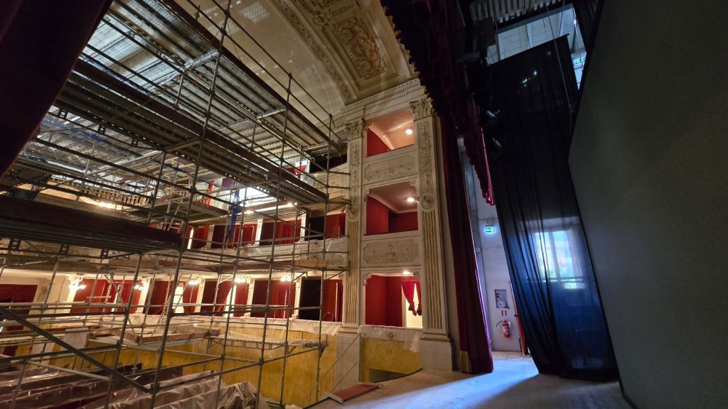 Il progetto di restauro e consolidamento è stato approvato nell’Aprile 2025 e i lavori sono stati aggiudicati alla Ditta esecutrice il mese successivo, grazie al finanziamento della Regione Toscana ed includono la messa in sicurezza delle parti a rischio, la rimozione dei depositi, la protezione delle superfici dipinte, il ristabilimento dell’adesione e della coesione degli strati pittorici e degli intonaci, e infine la velatura o reintegrazione delle aree mancanti. L’obiettivo principale è preservare e ripristinare l’integrità strutturale ed estetica degli elementi decorativi del teatro. I lavori sono ufficialmente iniziati il 19 maggio scorso.